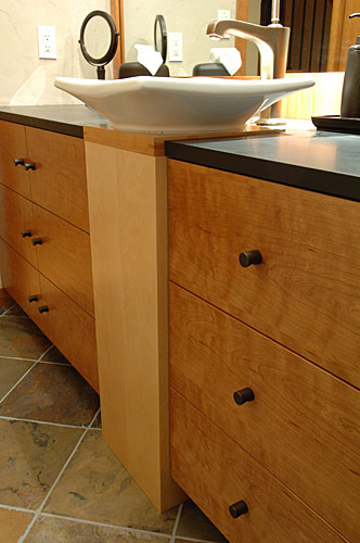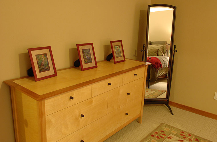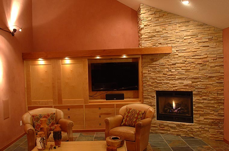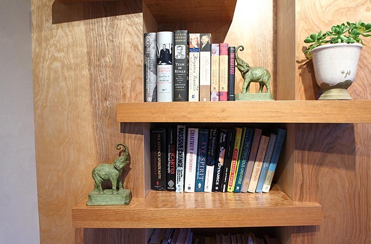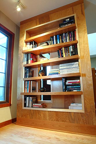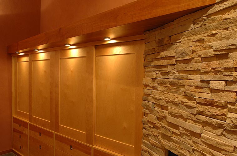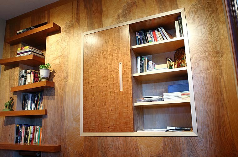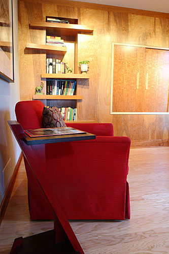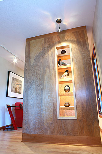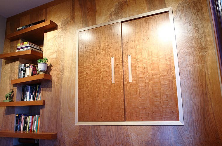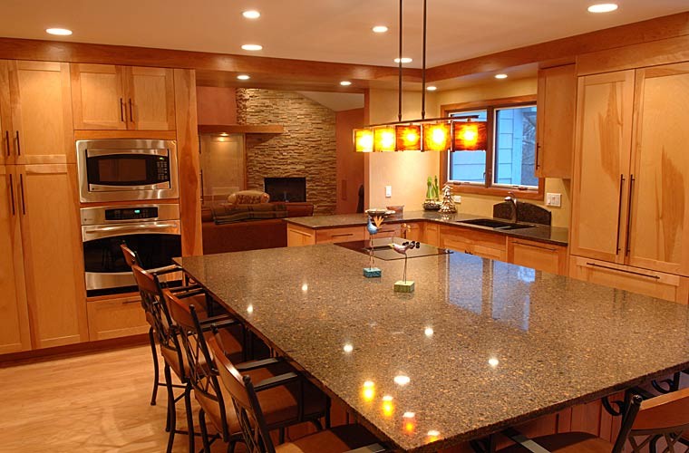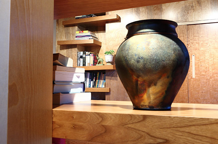 Several custom furniture pieces were created during the full main floor remodel. The pieces are sustainable and functional, with a warm, artistic appeal that takes advantage of the interplay between woods.