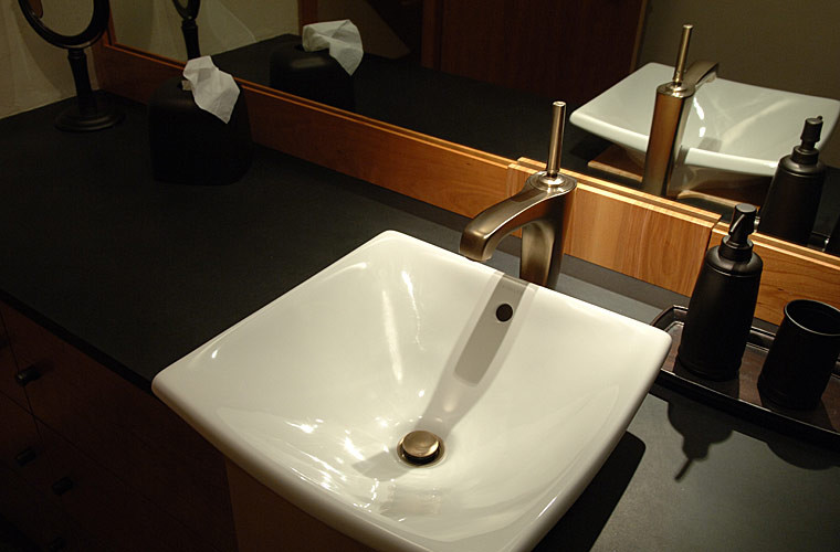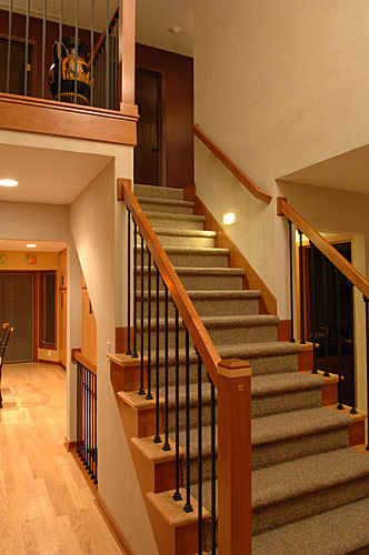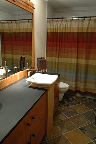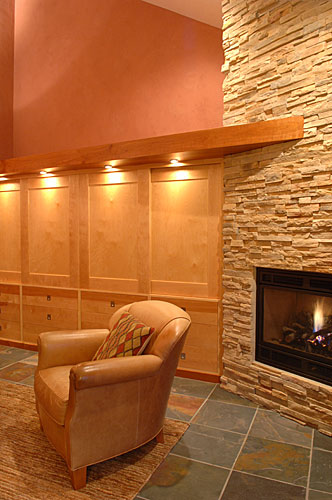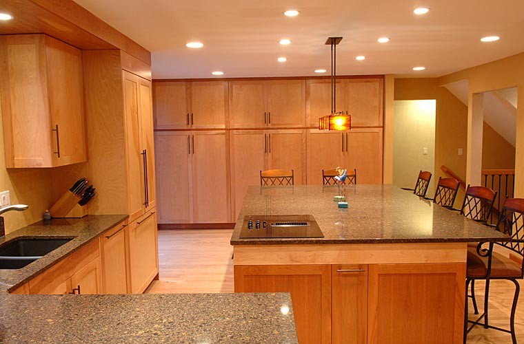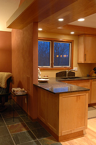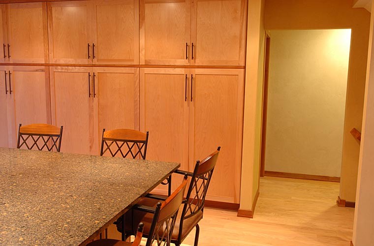 Our clients built their suburban Colonial-style home in the early 1980s. Near retirement, they decided it was time for a sustainable renovation to create a healthier, more natural environment to accommodate large family gatherings. Silent Rivers redesigned the main floor to improve connection between the kitchen and other living spaces. We focused on better air quality by using materials such as clay walls, no-VOC finishes and hard surfaces. Painted trim was replaced with solid wood millwork throughout. Flooring materials included reclaimed wood, slate and eco-friendly carpet tiles. The kitchen now serves as the heart of a home centered on a large island where people can congregate. Silent Rivers built custom furniture and cabinets throughout the home. The end result is a warm, comfortable and inviting home.