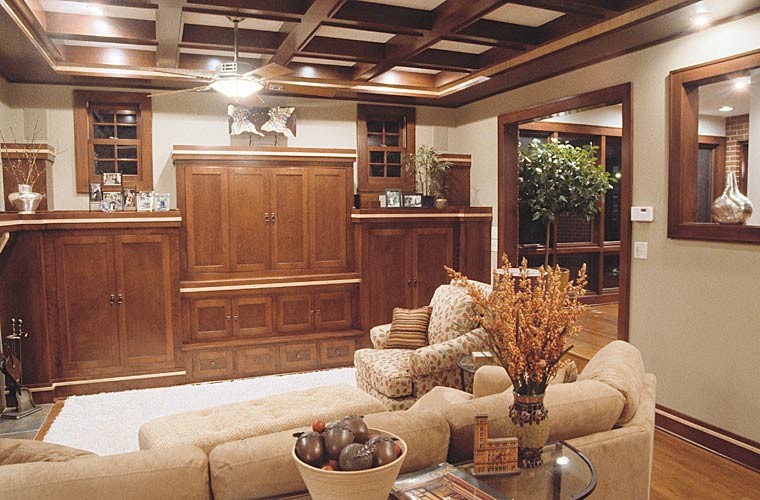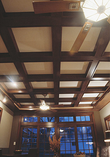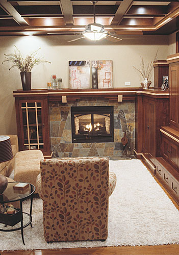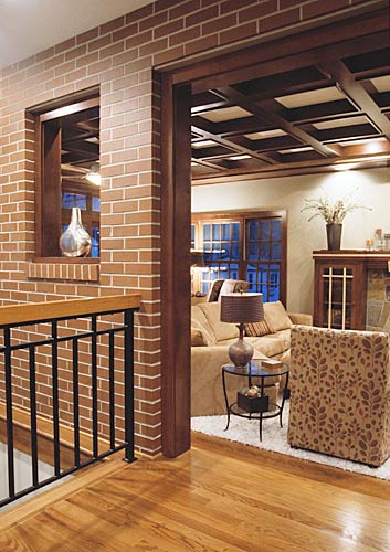 Our clients wanted to create a great room addition on their historic home. Since a turn of the century brick colonial home would not normally contain such a large space, it was paramount to complement its traditional character. The new family room, designed to look like a carriage house, is connected to the main house by a breezeway that balances the proportion of the addition. A new stair in the breezeway improves access to their lower level spa. The additional space provided opportunity to reorient the bathroom access away from the kitchen. The grid of the coffered ceiling in the great room helps provide intimacy. Craft was key; great attention was placed on blending new custom cabinets and millwork with 100-year-old wood. Similar attention was paid to matching brick style and mortar composition.