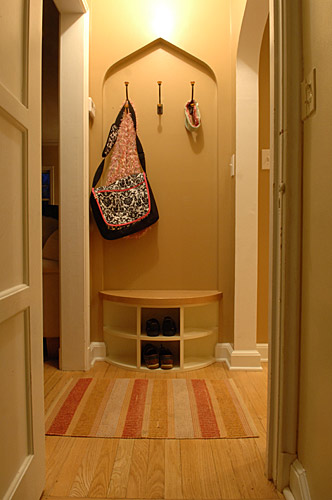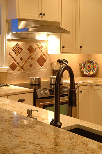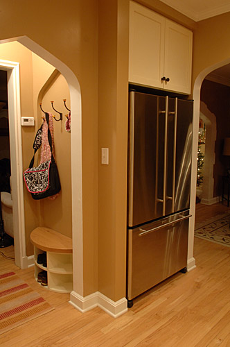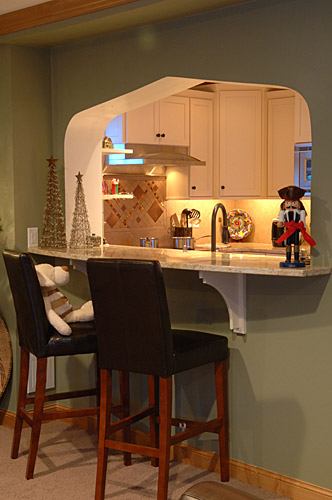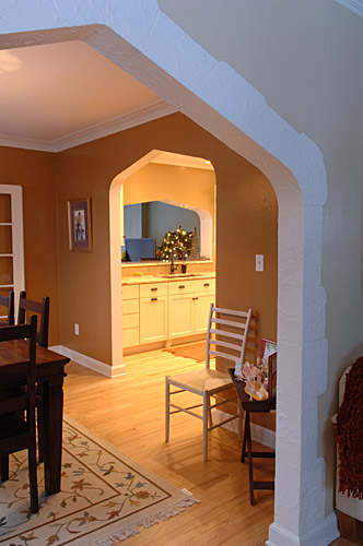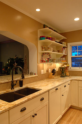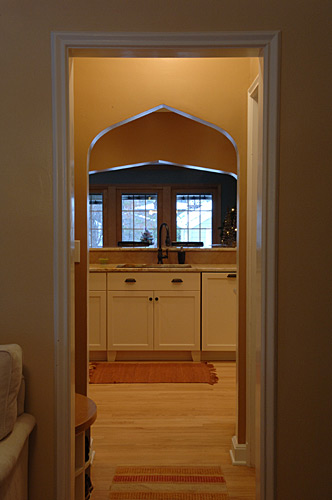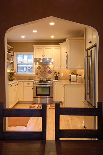 Our client wanted to update the kitchen in her 1930s brick home and fix problems created by previous remodels. Utilizing the existing footprint of the kitchen, we modified the floor plan to expand the amount of usable space and reduce the number of doorways leading into the space. A bartop pass-through was created to facilitate interaction with people in the adjacent room. It features a pointed arch which mimics an important design element found throughout the home’s architecture which is now incorporated into strategic places in this kitchen remodel. Relocating the refrigerator to a previous pantry closet created opportunity for a drop zone near the family’s main entry and features an inset pointed arch. Granite countertops and the tile backsplash took inspiration from the copper hues of the homeowner’s Mexican art. The existing wood floors were salvaged. Lighting design was another important element in order to achieve the homeowner’s goal of a space that glowed.