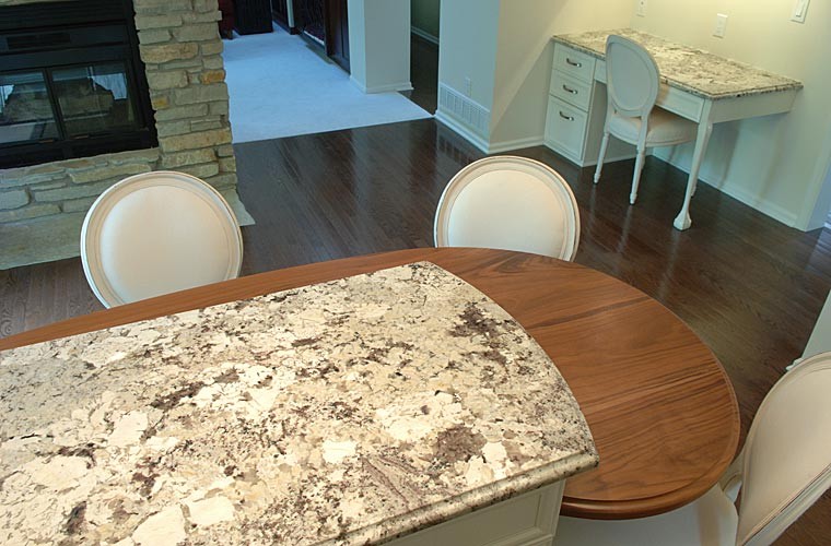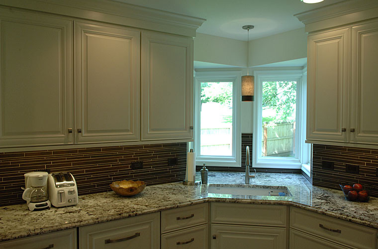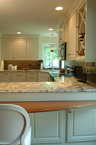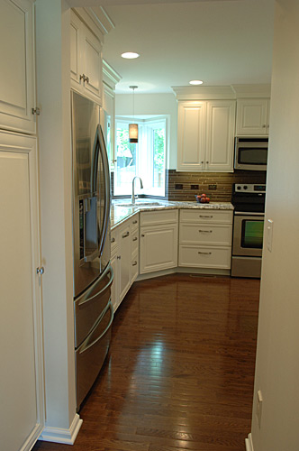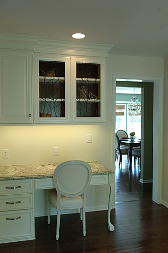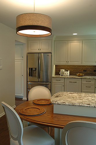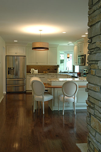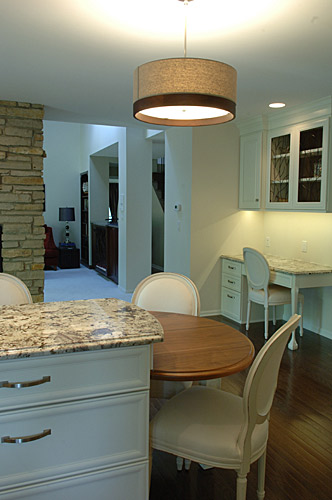 This client wanted a kitchen remodel to update the room with a better layout, making the space feel like it belonged with the rest of the home. We designed and built a new contemporary, cottage-like kitchen, influenced by both the exterior styling and the interior adjoining rooms. We replaced all the countertops and cabinets. The laundry area was moved to the basement, and we also refreshed the powder room as part of the remodel. We updated the lighting and extended the hardwood floors throughout the house.